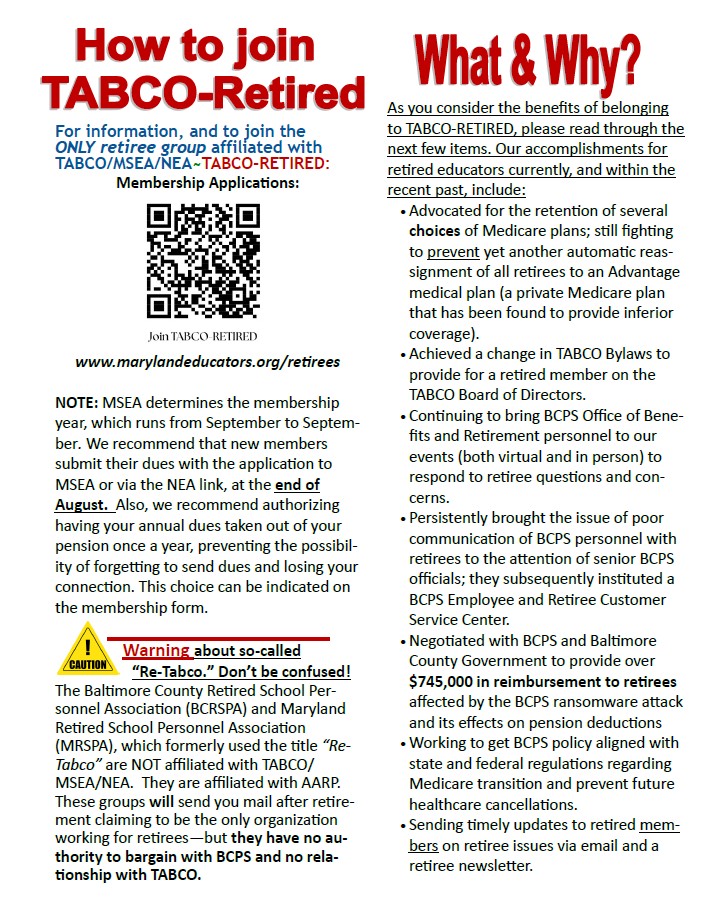 First, do not join MRSPA or BCRSPA when you receive their mailings. Although they may refer to their group as “ReTabco,” they have NO connection with TABCO. They are an AARP group.