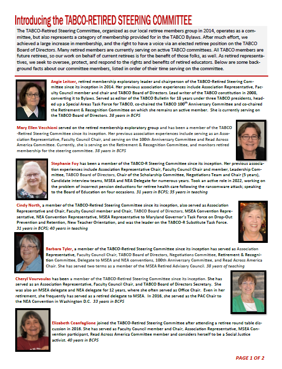 The TABCO-R Committee is established to maintain connections between retired members and the Teachers Association of Baltimore County, and to provide retirees with a core organizing body for the purposes of: