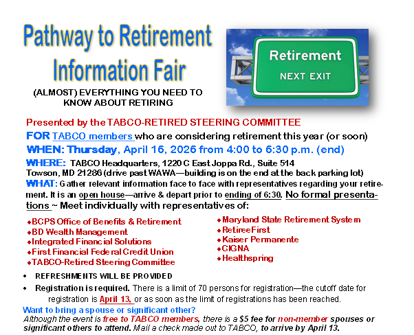 TABCO members who are considering retirement this year (or next) - come to this information fair and learn (almost) everything you want/need to know about retiring.