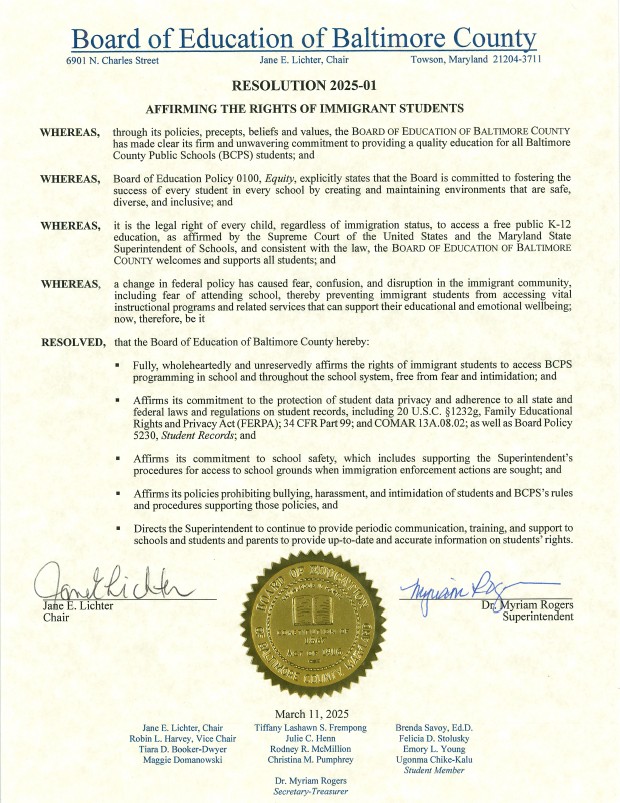 Our founding documents call for us “to be guided in all [our] actions by the highest sense of social and academic responsibility.” Further, those same bylaws call for us to “maintain and promote those conditions which will improve … the quality of service to students and the community.” Our collectively established values statement calls for us to “promote[] the betterment of education in Baltimore County for educators, students, families, and communities.” And the first goal in our official Policy Manual is “To guarantee public education as a basic right.” These have been TABCO’s core principles and governing charges, in times when stating them is controversial and when it is not. Since our founding in 1918, we have worked to educate all children, and we stand by our mission and purpose today. Beyond TABCO’s founding documents and values, the US Supreme Court has held that all children, regardless of immigration status, have a constitutional right to a K-12 education. It’s also important to note that all students have privacy rights based on federal FERPA protections. And while immigration issues may seem complicated, some things are simple: children do not decide where and how their parents choose to move. In short, TABCO is focused on educating children when they enter the schoolhouse, and we always will be.