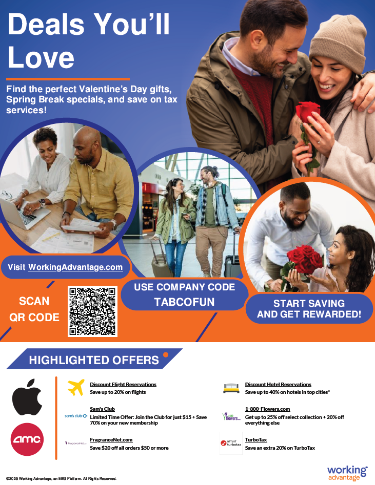 Access the Employee Discount Program by visiting www.WorkingAdvantage.com. TABCO members who wish to purchase discount movie passes must become of member of Working Advantage by using your work email or the company code: TABCOFUN.